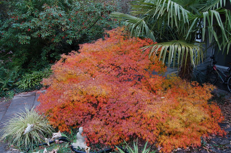 ist der Herbst der farbliche Höhepunkt./*Acer palmatum dissectum viride*/ zum Größenvergleich re das Fahrrad