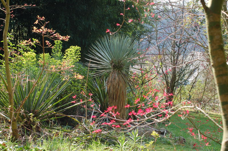 Acer palmatum Shindeshojo treibt mit seinen korallenroten Frühjhrblättern zaghaft aus. Dahinter /*Yucca linearifolia*/