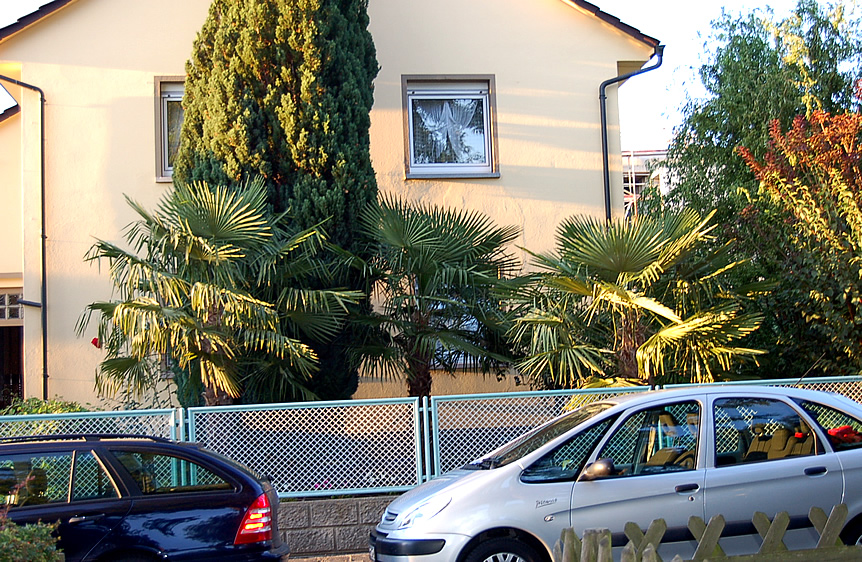 Noch ein Tip Sprendlingen Eisenbahnstr. Curryfarbendes Haus nähe ehmaliger Zahnfabrik dort stehen 2 rostratas eine oder sogar zwei Trachys ein Dicksonia und Musas.
