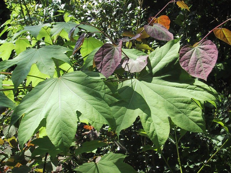 Riesige Blätter der Efeuaralie daneben Cercis canadensis Forest Pansy: absolut exotisch!!