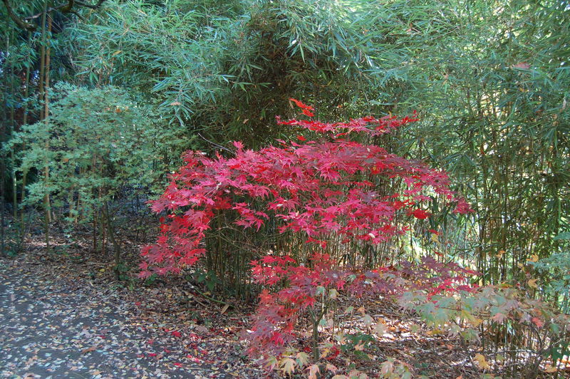 weiß der Teufel, was das heißt???, zumindest leuchtet dieser /*Acer palmatum Aka Shikitatsu sawa*/ seit Wochen leuchtendrot im Bambuswald!