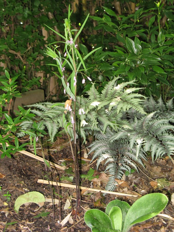 das filigrane Polyganatum curvistylum mit purpurvioletten Blüten erscheint erst Ende Juni. Dahinter der bunte Farn Athyrium japonicum var. pictum. Die genaue Sortenbezeichnung dieser noch durch gegabelte Wedelspitzen auffallende Form kennt vielleicht Otto ??