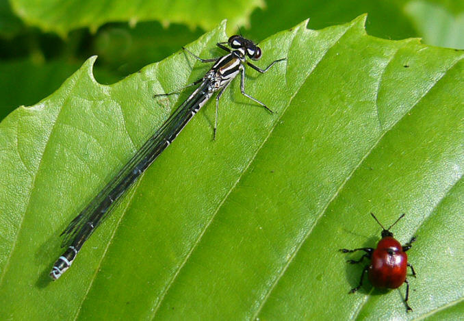 ..hier ein Stelldichein einer Libelle (offenbar /*Coenagrion puella*/ mit einem Blattkaefer auf Quercus pontica.