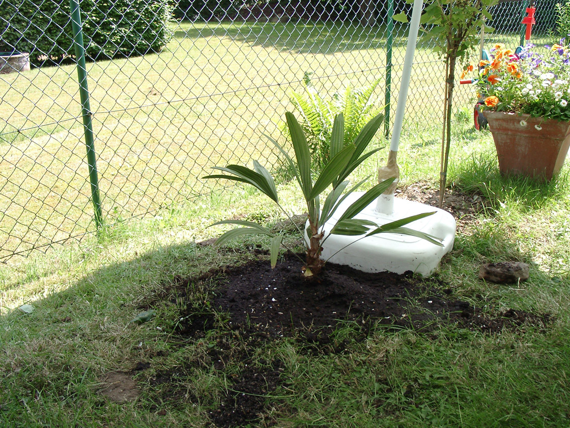 Wenn man sie vergleicht mit dem Foto von der Pflanzung vor gut drei Jahren, sieht man, daß die Blattstiele heute wesentlich kürzer und die Blätter gedrungener sind. Dafür ist der Stamm deutlich dicker geworden, bei Kauf hatte sie kaum Nadeln. Sie ist die ideale Palme für Leute mit kleinem Garten, die nicht wollen, daß die Trachys ihnen alles zuwuchern. Soll es ja mancherorts geben ;-)
