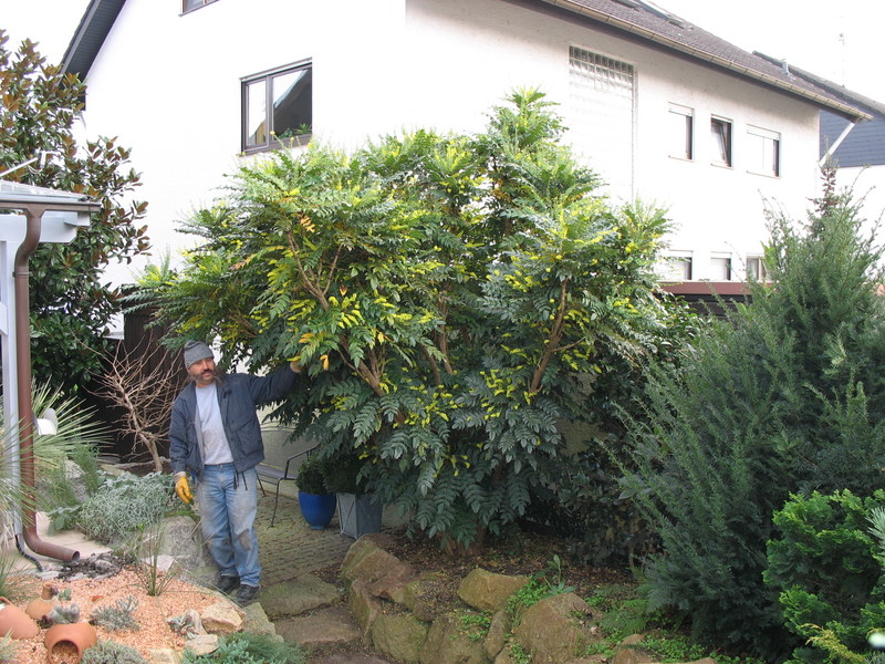 immer wieder interessant wenn man an den Ort früherer "Schandtaten" zurückkommt. Auch in anderen Gärten bewundere ich immer wieder wie sich diese Mahonie entwickelt. Je größer desto schöner, somal dann auch die interessante korkige Rindenstruktur zur Geltung kommt. Diese Pflanze wurde von mir im Juni 1996 gepflanzt und mußte besonders vorne zum Weg hin schon stark gestutzt werden. Ansonsten - besonders nach oben - ist Platz genug.