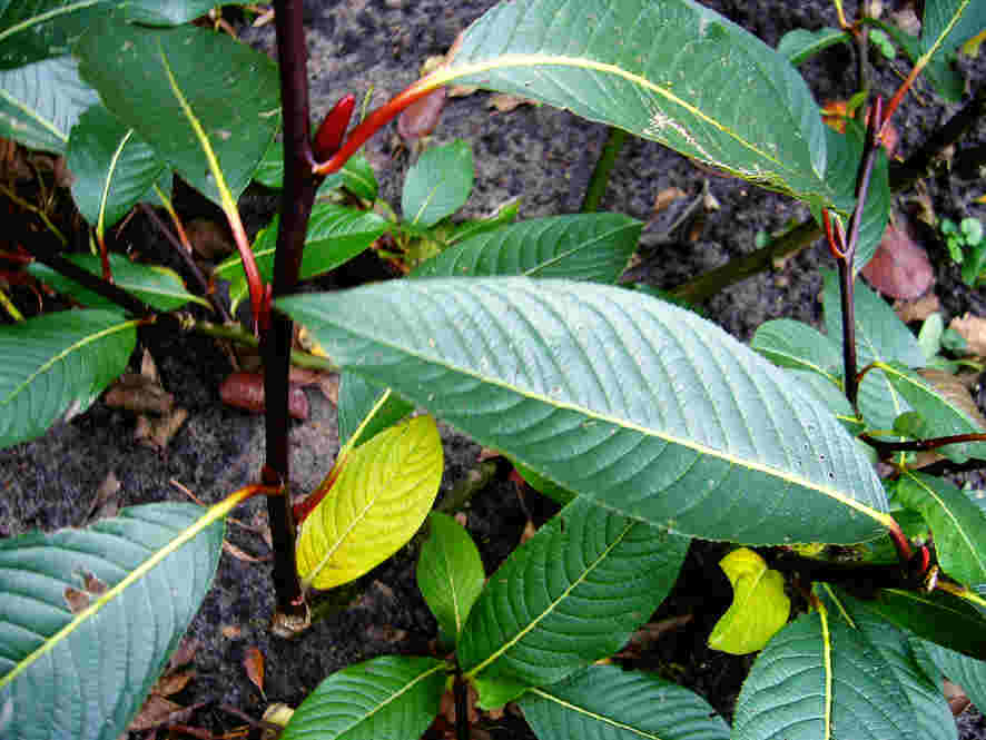 Die seltene /*Salix moupinensis*/ ist eine sehr attraktive Weide (Hillier-Manual: *Extremely ornamental at all times of the year).* Sie hat sehr grosse, blaugruene, glaenzende Blaetter und auffallend rote Knospen und Blattstiele sowie sehr lange Kaetzchen.