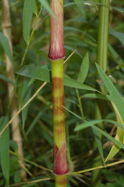 Erst vor wenigen Tagen ausgetrieben und - wahrscheinlich durch wechselnde klimat. Einflüsse (Sonne / Kälte) auffallend rötlich gefärbt: /*Chusquea breviglumis*/ aus Südamerika. Ob sie allerdings noch ausreift, ist unwahrscheinlich