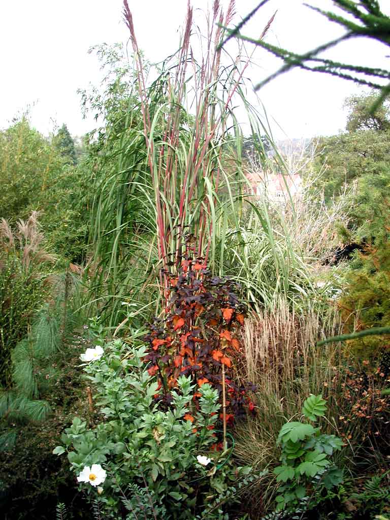 Im Hintergrung verschiedene Gräser, allen voran Erinathus ravennae, ca. 4m hoch und gerade im Beginn zu Blühen.