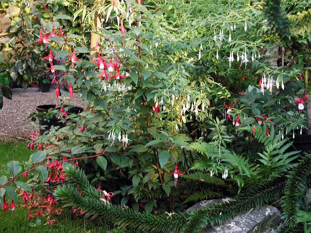 verschiedene winterharte Fuchsien, sie blühen bis zum ersten Frost