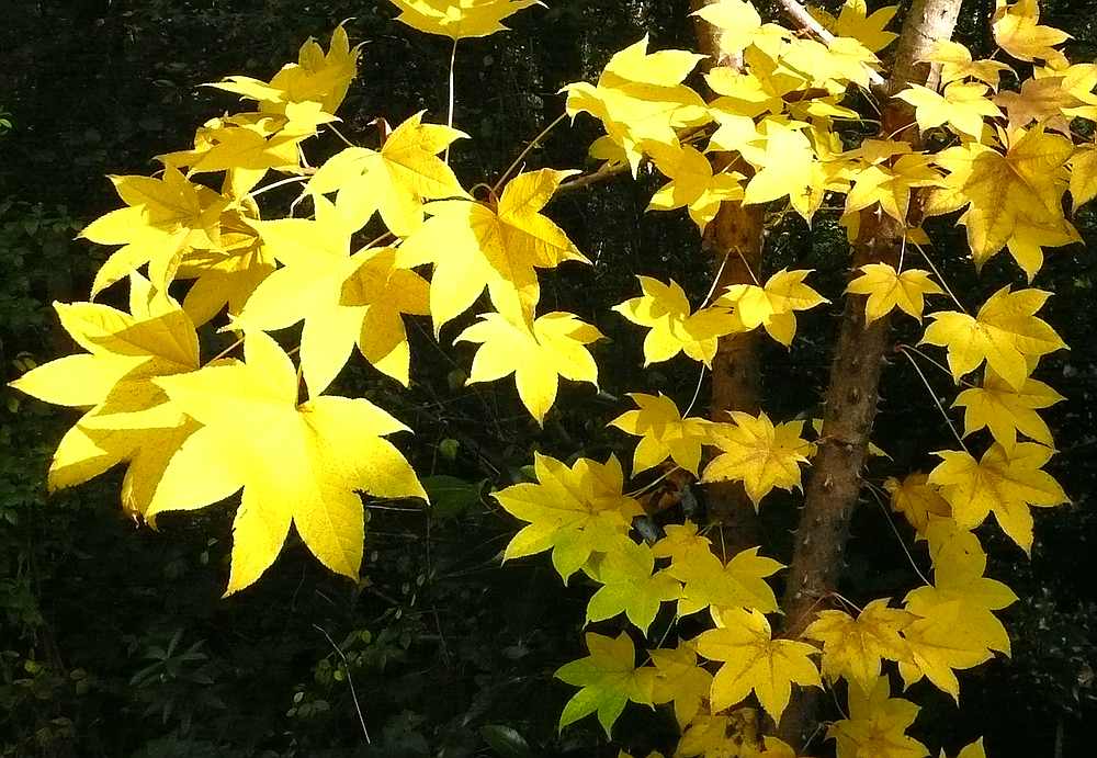 /*Kalopanax septemlobus*/ mit seinen teilweise riesigen, Fatsia-ähnlichen Blättern hat eine außerordentlich starke gelbe Herbstfärbung und macht insgesamt einen höchst exotischen Eindruck.