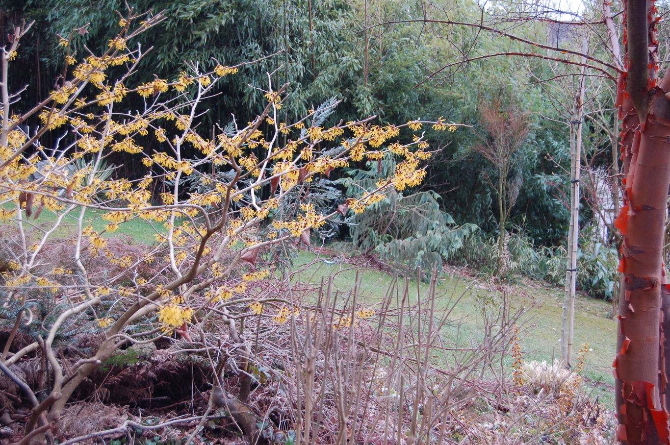 Hamamelis x intermedia neben Acer griseum, etwas bläulich durchscheinend Sequoia sempervirens Glauca #AM