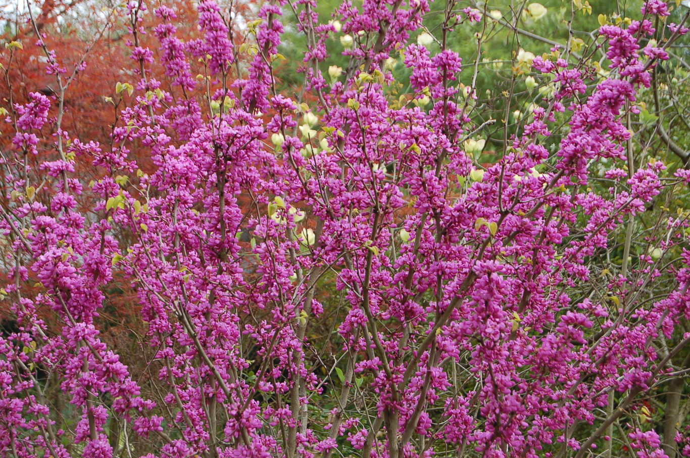 die angeblich so "zwergig" wachsende Cercis sinensis Avondale ca. 4m hoch mit Cornus nuttallii im Hintergrund!#AM