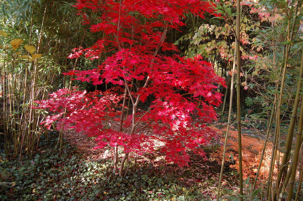 ist /*Acer palmatum Red Trompenburg*/, dessen ursprünglich fingerförmig konvex gewölbte Blattanteile in der Herbstzeit konkav nach oben verdreht sind