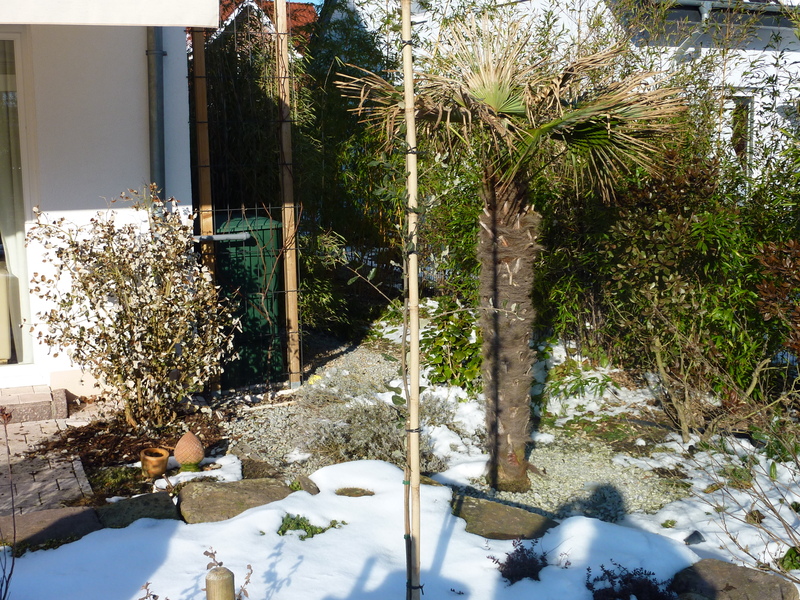 Meine erste Neupflanzung in diesem Jahr in der Hoffnung auf besondere Winterhärte(kaum zu erkennen als zartes Gewächs im Vordergrund). Im Hintergrund die gebeutelte Acca sellowiana mit 90% Blattschäden aber wohl intaktem Holz. Trachy ohne Worte.