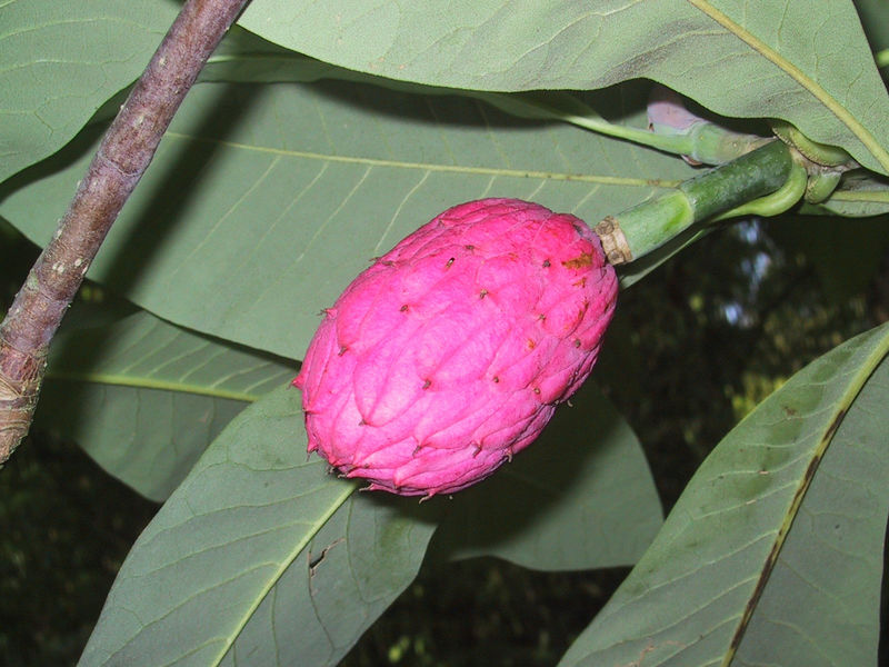 noch vor wenigen Wochen aufgenommen: die fast faustgroße, leuchtend violett-rote Frucht von /*Magnolia tripetala*/