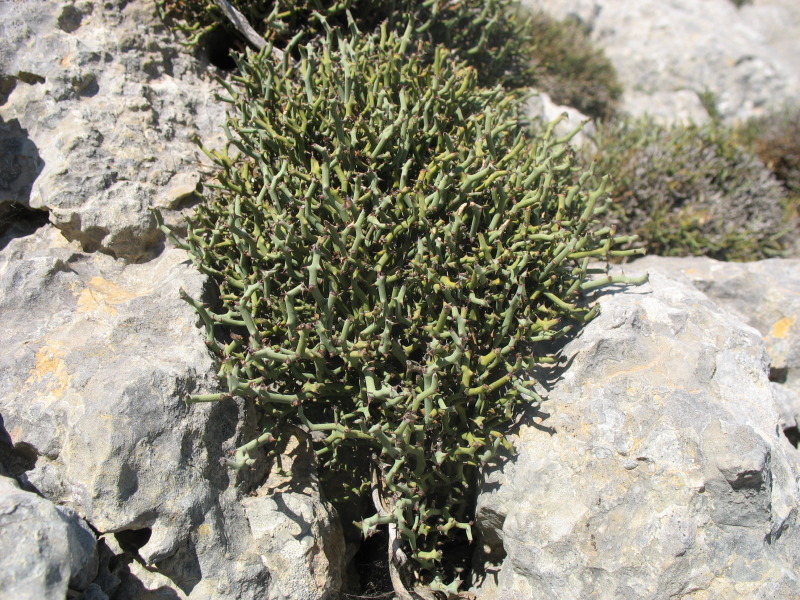 die Stachelwinde /*Smilax aspera*/ in ungewohnter Gestalt! Hätte man nicht die allmähliche Umwandlung der beblätterten Ranke zum harten blattlosen Polster beim Aufstieg beobachtet, man würde nicht glauben, dass es sich um ein und die selbe Spezies handelt. Man kann ohne weiteres auf diesen Polstern laufen. Dann bewegen sie sich sogar