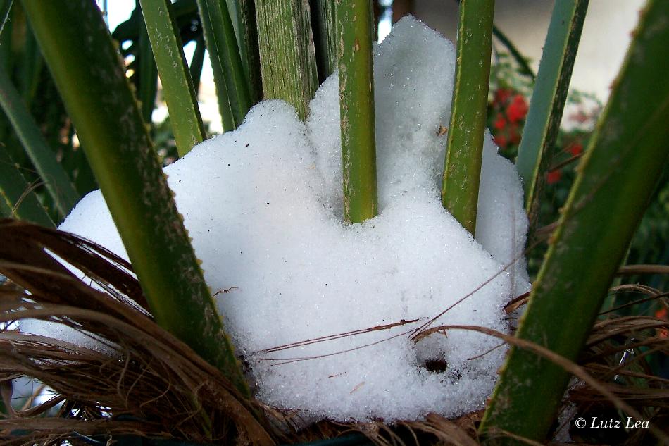 trotz der gestrigen 1,9°C und der heutigen 4,3°C (Plus natürlich), ist das Schneeehäubchen an der Stammspitze bei unserer Vorgarten-Trachy nicht, bzw. nur ganz gering angetaut, geschweige denn abgetaut.