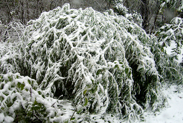 ein Schnee-Unwetter hat lokal hier die Region von Osnabrueck bis etwa Diepholz-Vechta im Griff. Die Exoten liegen unter einer dichten Decke und werden teilweise durch die Schneelast zu Bogen gedrueckt. Ich gehe von Zeit zu Zeit heraus und ruettele an den Trachy-Blaettern, auf denen kiloweise relativ nasser Schnee lagert. Auch Phyllostaychs vivax aureocaulis wird von Zeit zu Zeit geschuettelt, damit er bei seiner Duennwandigkeit nicht bricht.