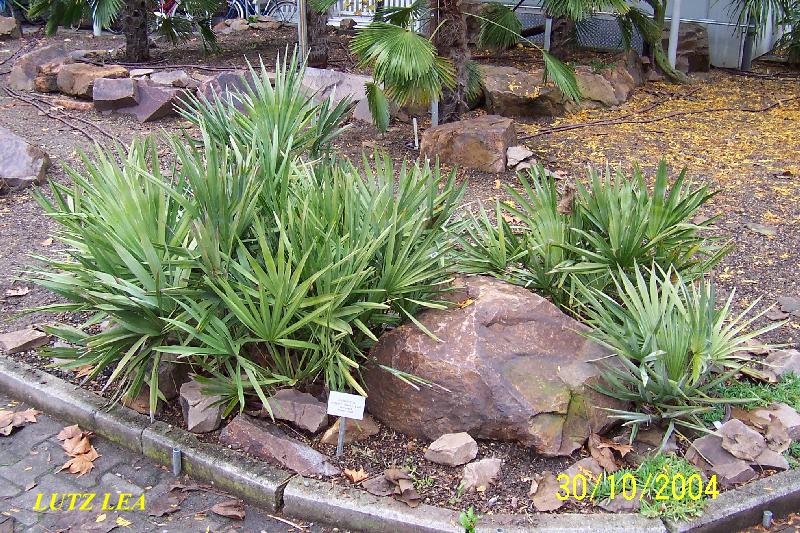 ... eine Gruppe ausgepflanzter 'Serenoa repens' Palmen. Alle auf diesem Beet befindlichen Palmen werden im Winter mit Schläuchen umlegt, durch die warmes Wasser geleitet wird. Ferner kommt ein Folientunnel über die Palmen!