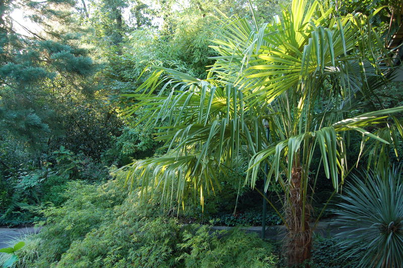 Dieser /*Trachycarpus fortunei*/ wiederum hat auffallend weiche, peripher geknickte (Form: "pendulans") Blätter. Die vorherige könnte man als "Rigida"-Form bezeichnen (abs. willkürlich)