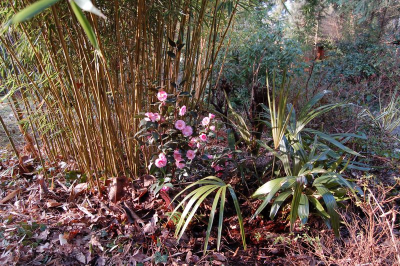 Extrem dicht und nachdem sie Fuß gefasst hatte, sich ziemlich schnell ausbreitend:Fargesia robusta,hier neben Rhapidophyllum und Camellia jap.