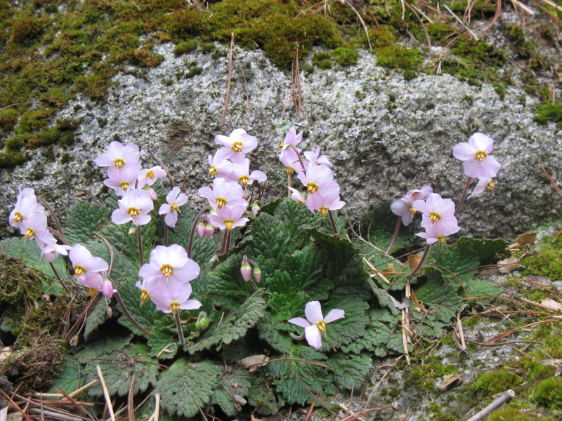und hier die Form /*Ramonda myconi 'Rosea'*/. Beide Pflanzen gehören noch zur Grundausstattung meines "Steinhaufen" im Hof, d.h. vor 18 Jahren gepflanzt und wie es aussieht habe ich noch lange daran