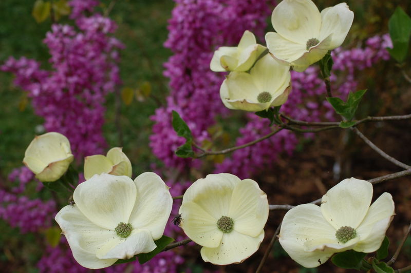 Hatte ich hier schon einmal vor 3-4 Tagen gezeigt, da waren sie noch gelblich.Jetzt sind sie schneeweiß (/*Cornus nuttallii Eddies White Wonder)