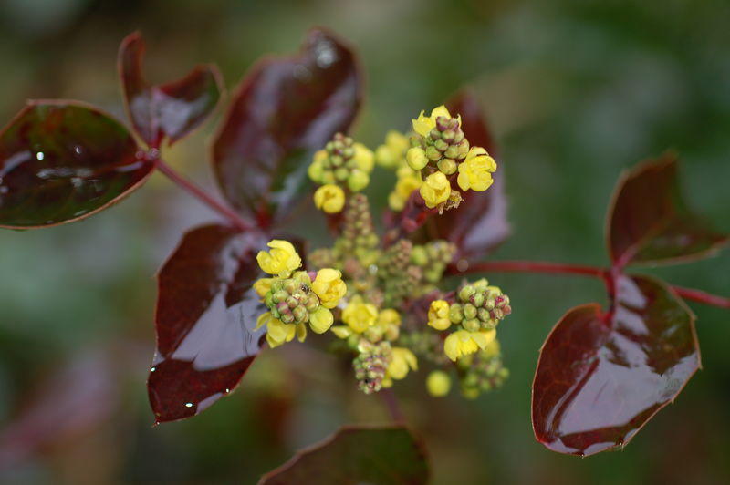 Wo sonst nichts wächst, da wächst /*Mahonia aquifolium*/, das sich mittlerweile im ganzen Garten wie Unkraut ausgebreitet hat