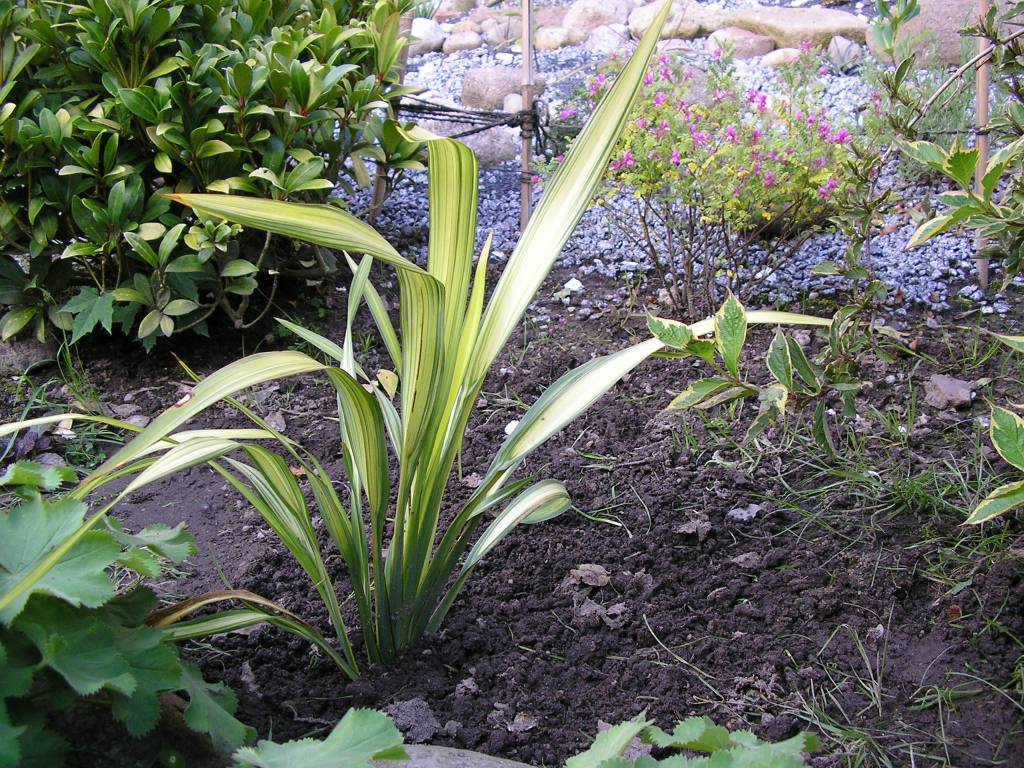 Neben Phormium tenax purpureum 'Dazzler' = rötlich panaschiert eine grün-weiß gestreifte Zwergform: