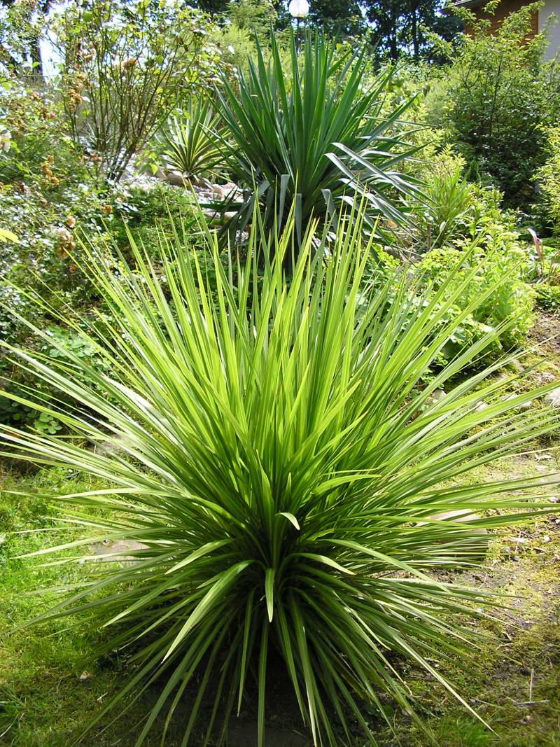 dieses Bild zeigt vor allem Blattstruktur, Cordyline australis, dahinter Yucca gloriosa x recurvifolia und Y. gloriosa variegata