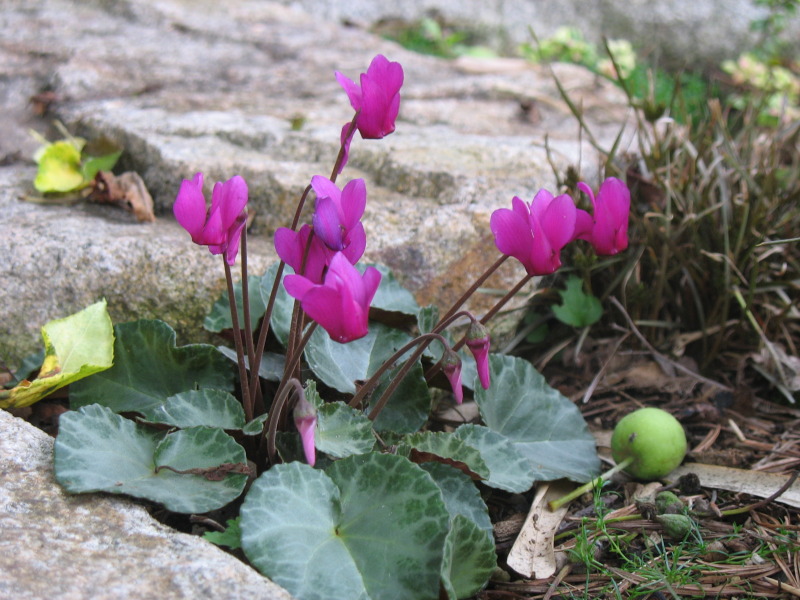 hat begonnen. Nach der Frühjahrsblüte und einer längeren Pause geginnt nun Cycamen pururascens mit der Blüte. Im Bild von heute Abend die recht intensiv Form C. p. 'Silver Leaf'.