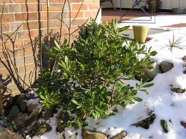 Ist zwar nicht so winterhart, aber das gezeigte Exemplar habe ich selbst gezogen aus ligurischer Saat. Ist auch erst seit März 04 ausgepflanzt. Wie man sieht, nach -16° ohne Schutz aber noch sehr passabel. Wächst relativ langsam; gut die Blüte im Frühjahr ist nicht so spektakulär, aber die glänzenden Blätter sind immer schön.