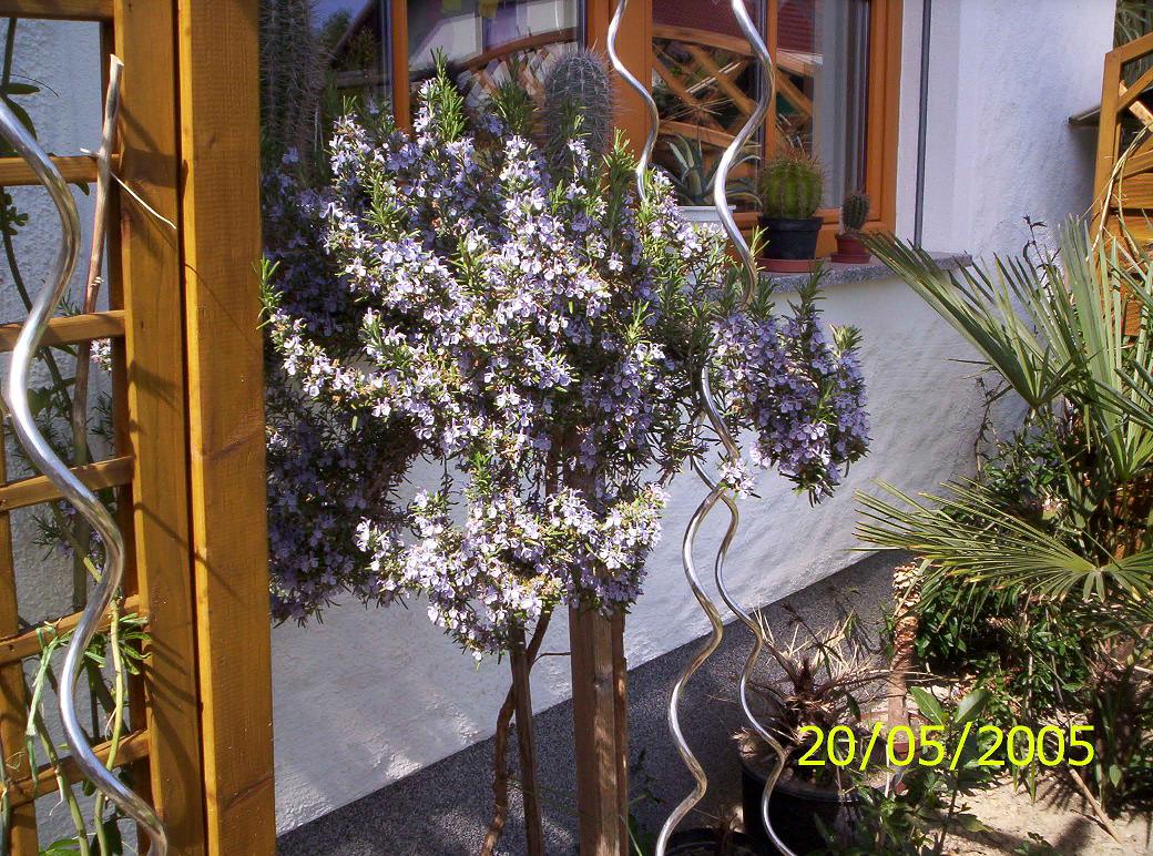Dieser Rosmarin ist seit 1999 bei uns ausgepflanzt, war ursprünglich ein breiter Busch, von dem nach dem Winter 01/02 nur ein Ast übrig geblieben ist. Aus diesem Ast ist nun ein schönes Hochstämmchen geworden, das seither keine Frostschäden mehr hat. Links sieht man schon Passiflora Caerulea "Constance Elliot" das Rankgerüst emporklettern, im Herbst wird man vom Rosmarin nicht mehr viel sehen!