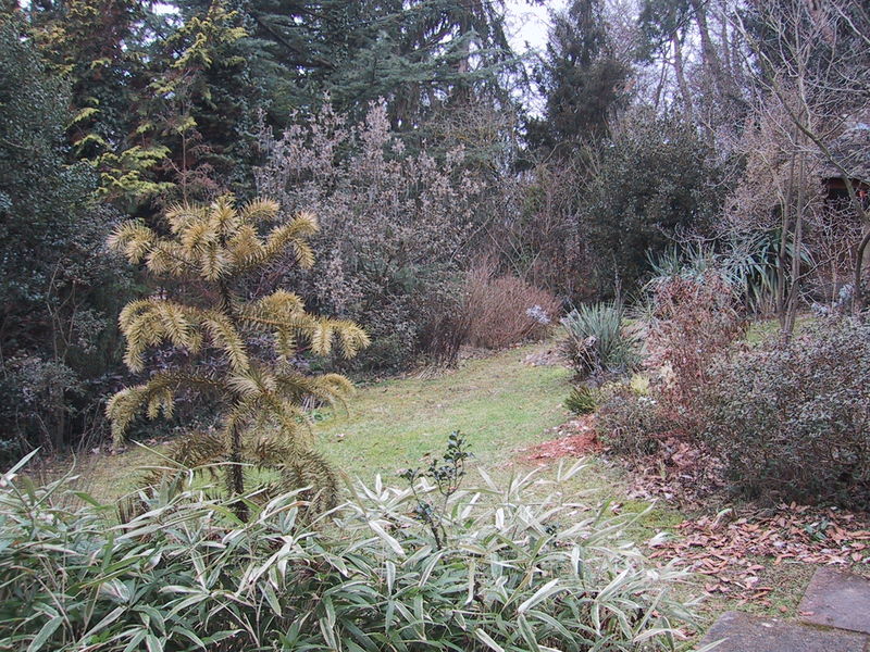 vorne re Daphne tangutica(!) z.T. braune Blätter, daneben Daphne bholua und Viburnum harryanum komplett braun