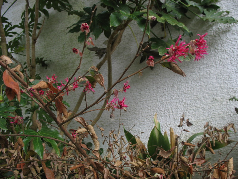 es gibt doch noch Wunder: Loropetalum chinense, in der Vergangenheit immer eine der Ersten mit starken Winterschäden (soll laut Räto Eisenhut selbst im Tessin Zicken machen) treibt aus allen Poren Blüten, obwohl alle Blätter seit dem Frost Heu sind.