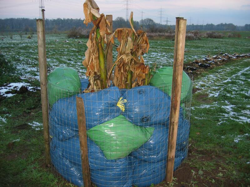 erstmals probiere ich bei den Bananen in Messel eine etwas abgewandelte Form des klassischen Drahtkastens- einmal um Arbeit zu sparen und ich denke diese Art hat ein paar Vorteile.