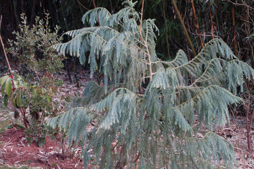 zählt auch /*Taiwania cryptomerioides*/,li daneben die mallorkinische, deutl. härtere Selektion von /*Quercus coccifera*/ und Daphniphyllum, der von ursprünglich über 2m Höhe zurückgefroren war und jetzt wiederum einen "auf den Deckel" bekommen hat
