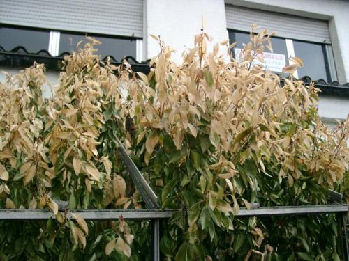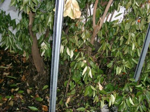 Die unteren geschützteren Blätter der Ziermandarine sind bei dem Dauerfrost vertrocknet: