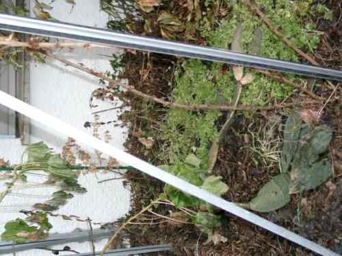 Links neben der Ziermandarine liegt eine erfrorene Opuntia ficus- indica, im Vordergrund erfrorener Hibiscus rosa-sinensis und hintendran eine erfrorene Bougainvillea.