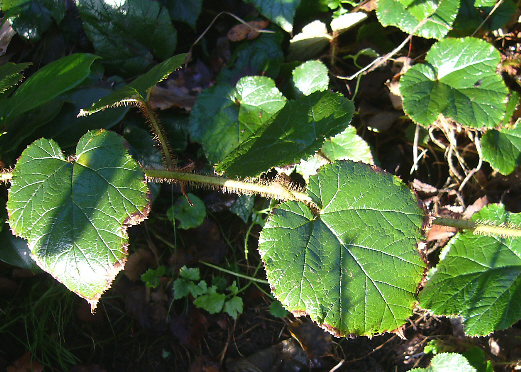 Der immergr�ne Rubus tricolor hat oberseits dunkelgruene, glaenzende und unterseits weisse Blaetter, die Stengel sind dicht rotbraun druesenborstig (3 Farben = tricolor).