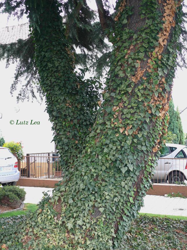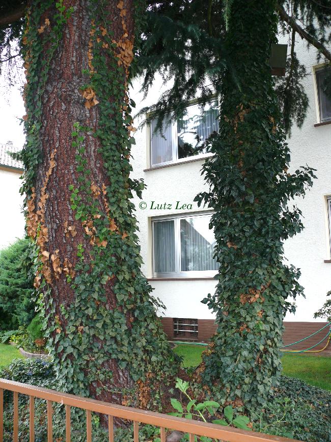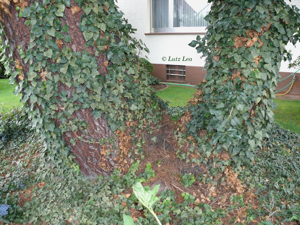 Ich klingelte und bekam das Auspflanzjahr 1961 genannt. Interessant ist der mit Efeu bewachsene Doppelstamm, wobei der linke zur Straße hin weisende der stärkere ist. Ob es sich hier um eine Art "Zwieselbildung" handelt sei dahingestellt.