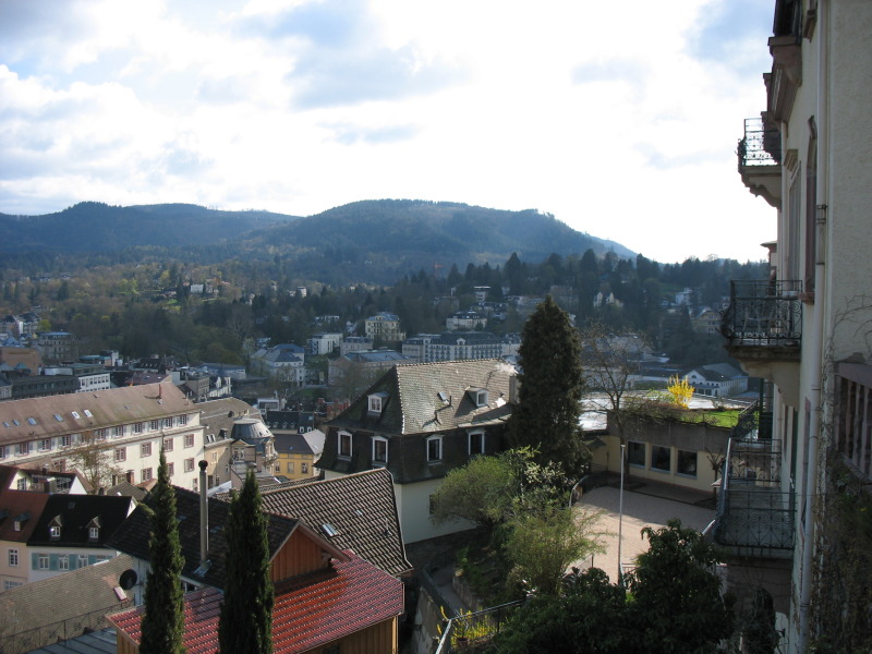 Blick über Baden-Baden vom Fuße des Neuen Schlosses aus. All diese kegelförmigen dunklen Bäume über die Hügel sind Sequiadendron giganteum und das rund um den Talkessel. Alte Bäume und damit das so bleibt werden beständig junge nachgepflanzt.