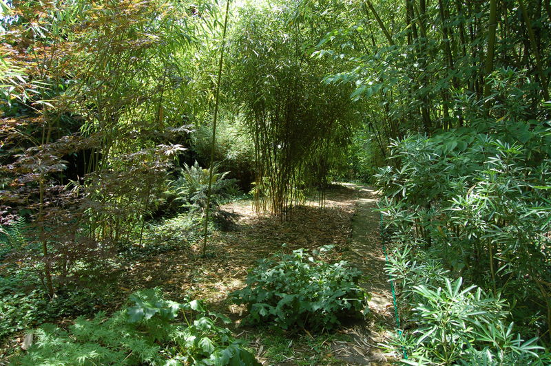 Gegenlichtaufnahme mit /*Choisya ternata Aztec Pearl*/ re, in der Mitte Acanthus hungaricus und mollis, hi li immergrüne Farne und natürlich Bambus, Bambus, Bambus......![]()