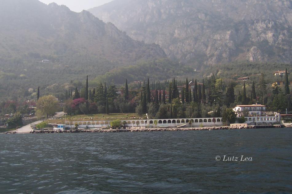Blick vom geliehenen Motorboot aus auf 'Limone' (Höhe Hotel "Leonardo da Vinci". Ganz herrlich in Rosatönen blühten die vielen alten