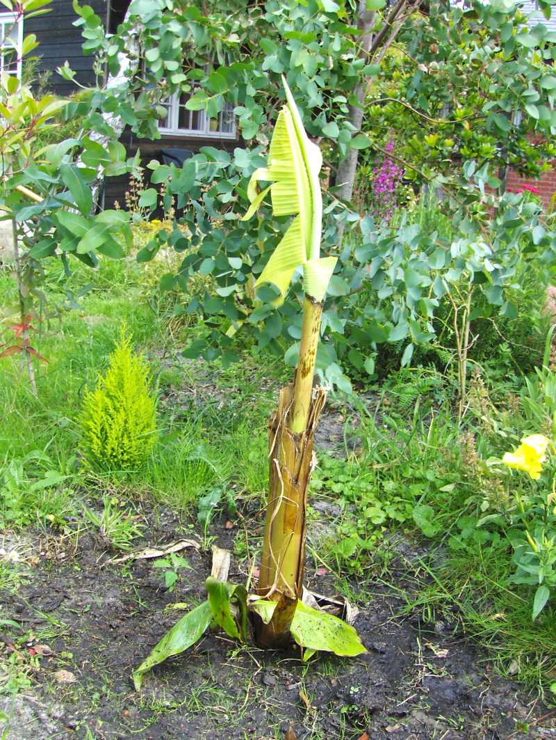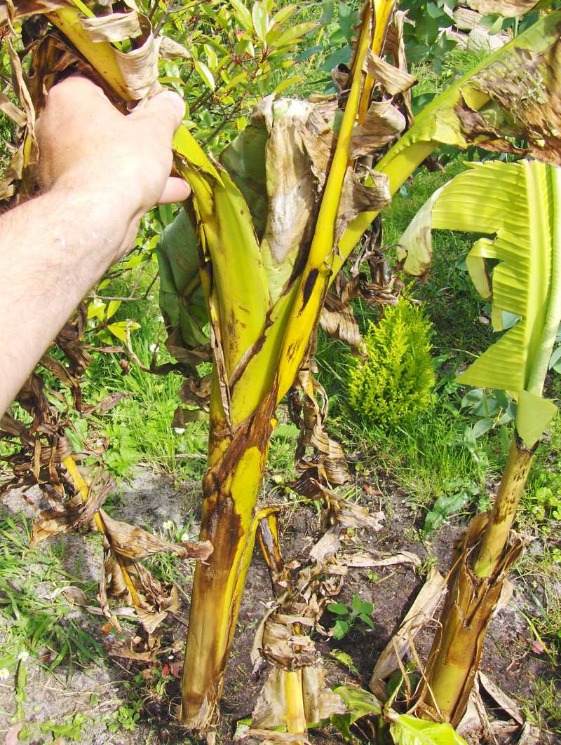 Ubrigens - Weil nicht immer alles rosarot ist: Diese Musa basjoo war bereits stolze 2m und ist im Sturm völlig abgebrochen. Jetzt macht sie wieder bei einem Meter weiter - schade!