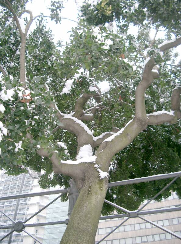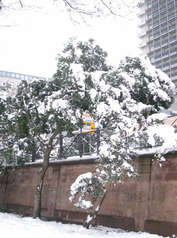 Den folgenden recht grossen immergruenen Baum habe ich an der Mauer am Main gar nicht so weit vom Nizzagarten entfernt gesehen.