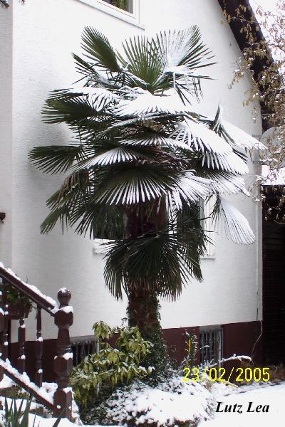 als ich heute zum Toom-Baumarkt nach Egelsbach fuhr, um einen neuen Schneeschieber zu kaufen, nutzte ich gleich mal die Gelegenheit eine sich dort in der Nähe gedeihende ca. 3,5 m hohe und im Jahre 1981 ausgepflanzte Hanfpalme in einem rückwärtigen Garten zu fotografieren.