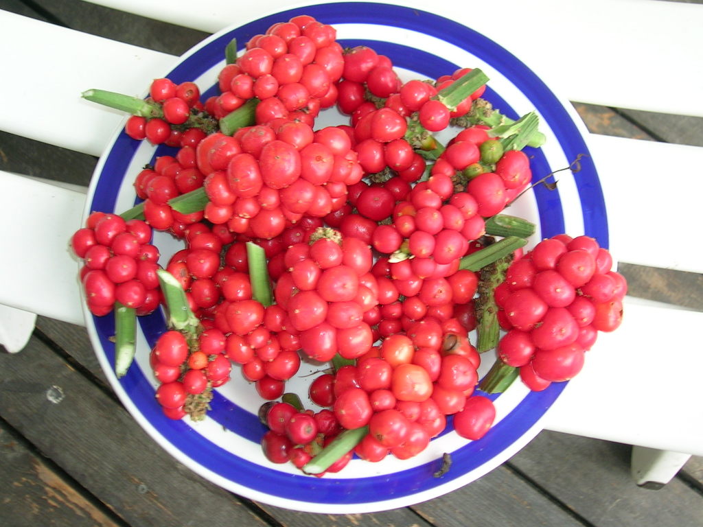 Meine Rohdeas haben mich monatelang über den Winter - wenn sie nicht gerade eingeschneit waren - mit ihren dekorativen Fruchtkolben erfreut. Vorgestern Nachmittag habe ich genau den Zeitpunkt genutzt, als der Schnee gerade einmal weitgehend abgetaut war und habe kurz vor dem erneunten Einschneien mit eiskalten Fingern die Beeren zur baldigen Aussaat sichergestellt.