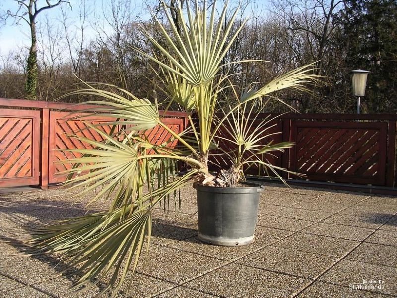 Bild von Nannorrhops ritchiana. Trotz kalter Nächte (heute -5/-6°C je nach Lage im Garten) immer noch im Topf draußen. Sie kann sich aber tagsüber in der warmen Sonne noch gut aufwärmen. Die Tage mit leichtem Dauerfrost (0°) im Nebel hat sie auch problemlos überstanden.