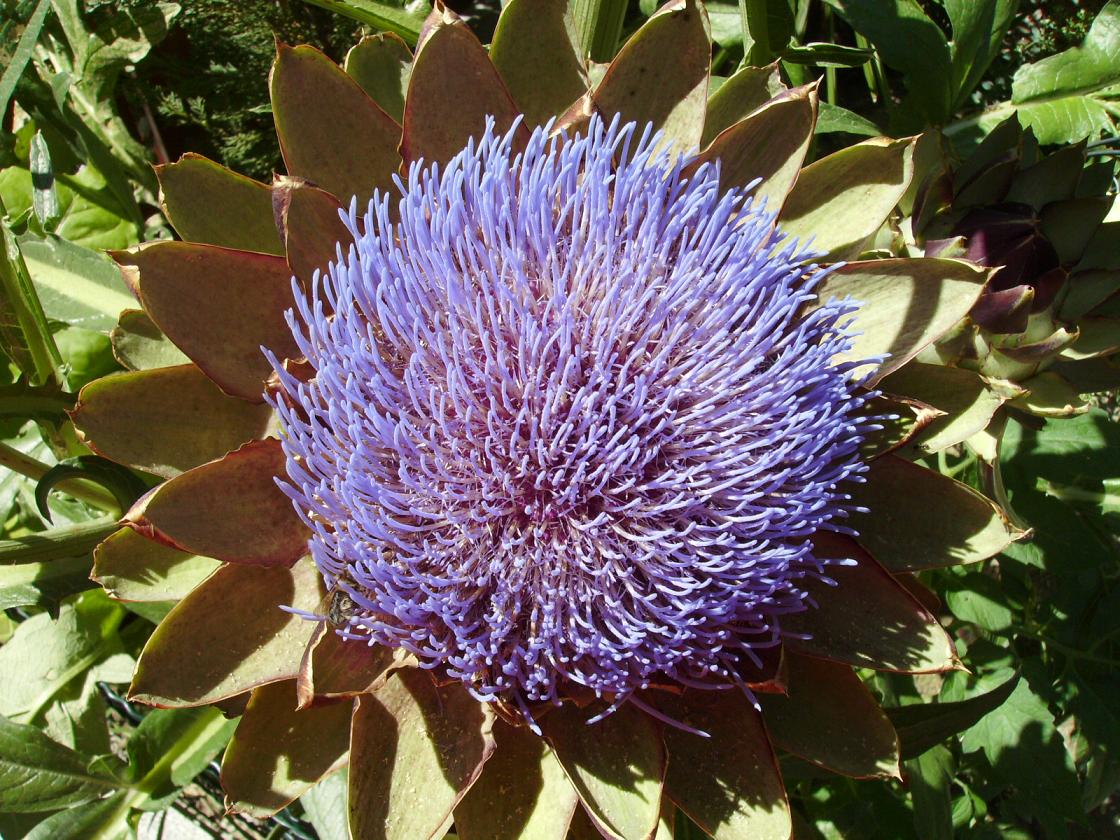 Ach ja, hier noch ein Foto von der bis zu 30cm großen Artischoken-Blüte, die übrigens auch von den Bienen sehr geliebt wird: